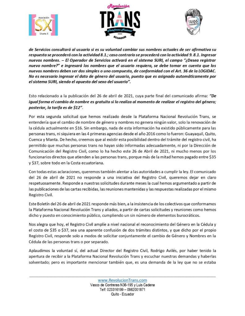 Por esta segunda solicitud que hemos realizado desde la Plataforma Nacional Revolución Trans, se entendería que el cambio de nombre de género y nombres no genera ningún valor, solo la renovación de la cédula actualmente en $16. Sin embargo, nada de esta información ha existido públicamente para las personas trans, ni siquiera en las 4 primeras agencias desde el año 2016 como lo fueron: Guayaquil, Quito, Cuenca y Manta. De hecho, creemos que al existir esta posibilidad dentro del trámite del registro civil, ha permitido que muchas personas trans no hayan sido informadas adecuadamente, ni por la Dirección de Comunicación del Registro Civil, como lo ha hecho este 26 de Abril de 2021, ni mucho menos por los funcionarios directos que atienden a las personas trans, porque más de la mitad hemos pagado entre $35 y $37, sobre todo en la Costa ecuatoriana.