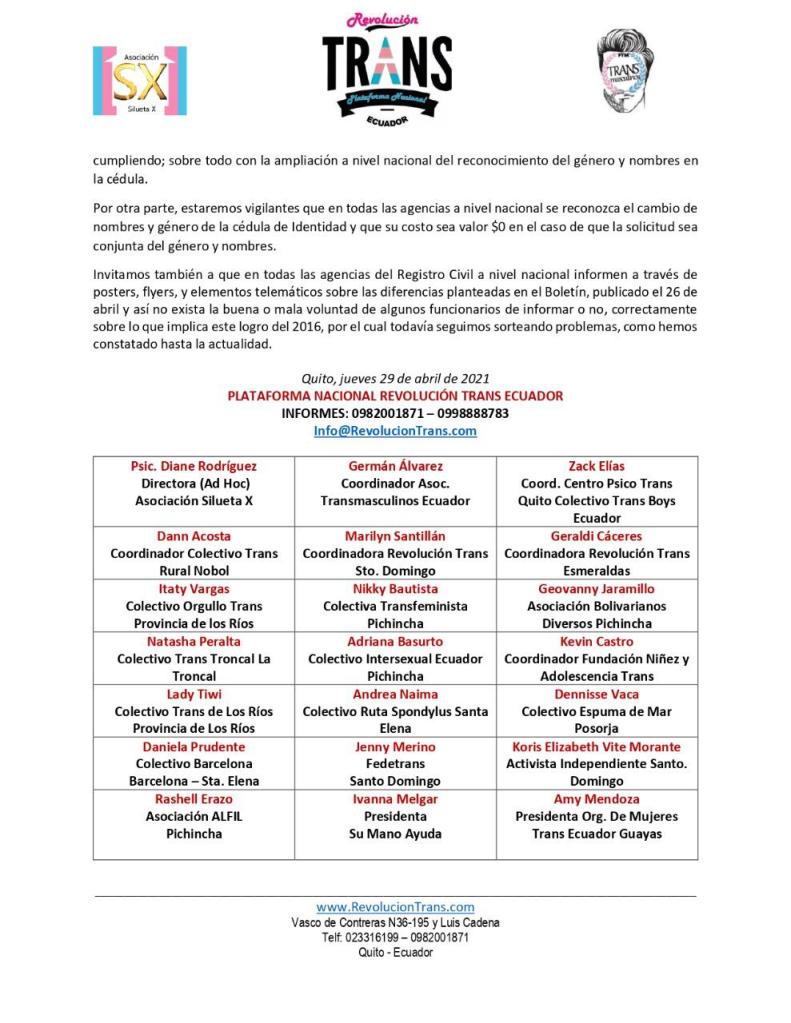 Ante este oficio del 26 de abril de 2021 del Registro Civil, la Plataforma Nacional Revolución Trans, ve con buenos ojos que luego de varios procesos de intervención nuestra, haya tenido como resultado una de las solicitudes que se venia realizando desde el año 2018, como demanda la ley aprobada en el año 2016 del “Género en la Cédula”.