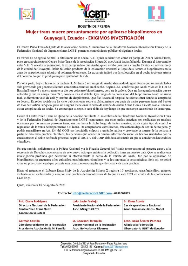 En este sentido, solicitamos a la Policía Nacional y a la Fiscalía General del Estado tomar asunto al presente caso y a la secretaria de Derechos, apersonarse de este nuevo acto que enluta a la población trans en nuestro país. Que se realice una investigación profunda que determine si efectivamente la causa de la muerte de Anahí, fue por la aplicación de biopolimeros; se encuentre a los culpables, encubridores, cómplices y se les imponga la pena máxima. Sólo así, se podrá crear un precedente legal que permita una penalización ejemplar que destierre esta mala práctica.