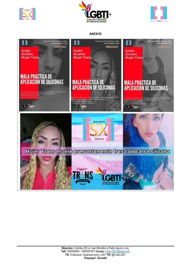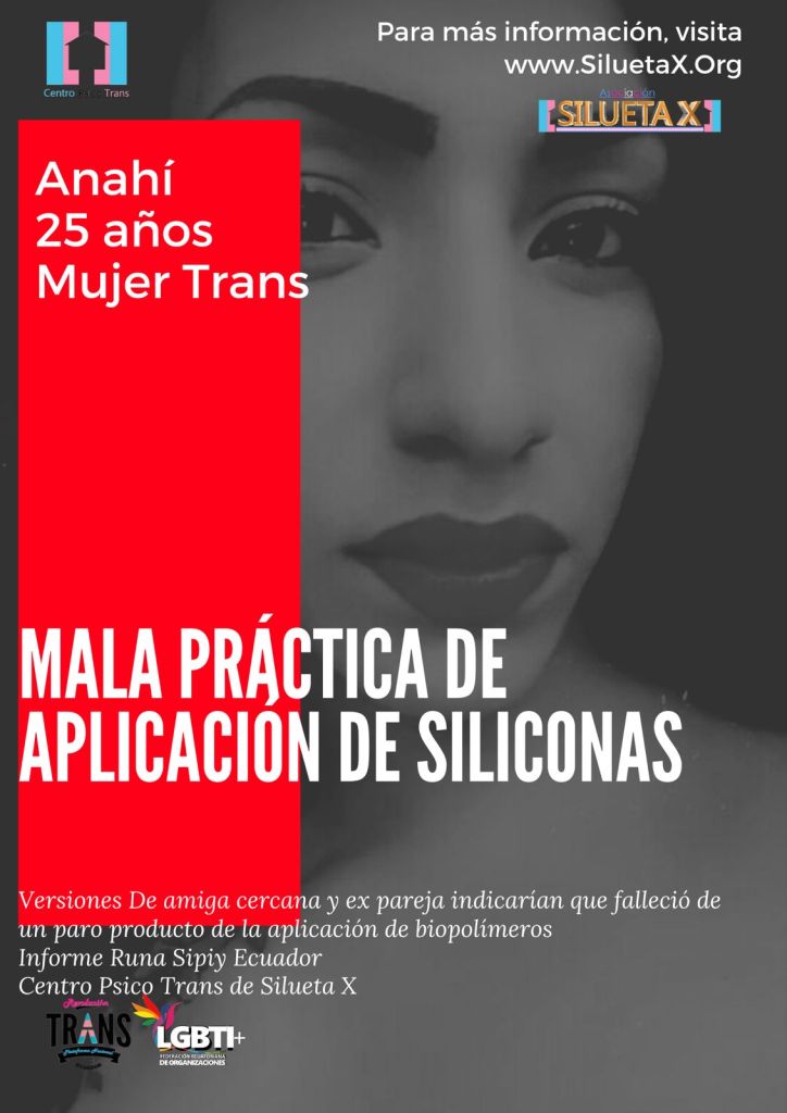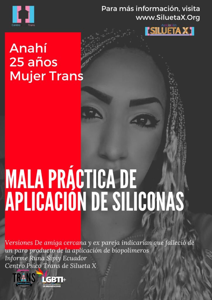 El martes 18 de agosto de 2021 a altas horas de la noche, V.H. quien se identificó como ex pareja de Anahí Arana Flores, puso en conocimiento al Centro Psico Trans de la Asociación Silueta X, que Anahí había fallecido. Durante el intercambio entre V.H. Y nuestra organización, la ex pareja indicó que Anahí, quien estaba próxima a cumplir 25 años en noviembre y de la ciudad de Guayaquil, había fallecido producto de la colocación artesanal e ilegal de siliconas o biopolímeros en la zona de su pecho, para adquirir el volumen de un seno. La ex pareja indicó que la colocación en el pecho tocó una arteria del corazón, lo que le produjo un paro quitándole la vida.