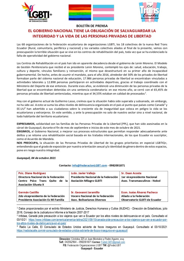 EXPRESAMOS, solidaridad con las familias de las Personas Privadas de la Libertad (PPL), que han sido asesinadas en la cárcel de Guayaquil, durante el fin de mes de septiembre e inicios de este mes de octubre de 2021. EXIGIMOS, al Gobierno Nacional, a mejorar sus procesos estructurales que permitan responder adecuadamente ante delitos y se retome una rehabilitación social basada en los tratados internacionales, de los que Ecuador es suscriptor, como el Acuerdo de Mandela. NOS PREOCUPA, la situación de las Personas Privadas de Libertad de los grupos prioritarios en especial LGBTIQ+, entendiendo que el grado de exposición por nuestra orientación sexual y/o identidad de género dentro de estos espacios, pone en riesgo nuestra integridad.