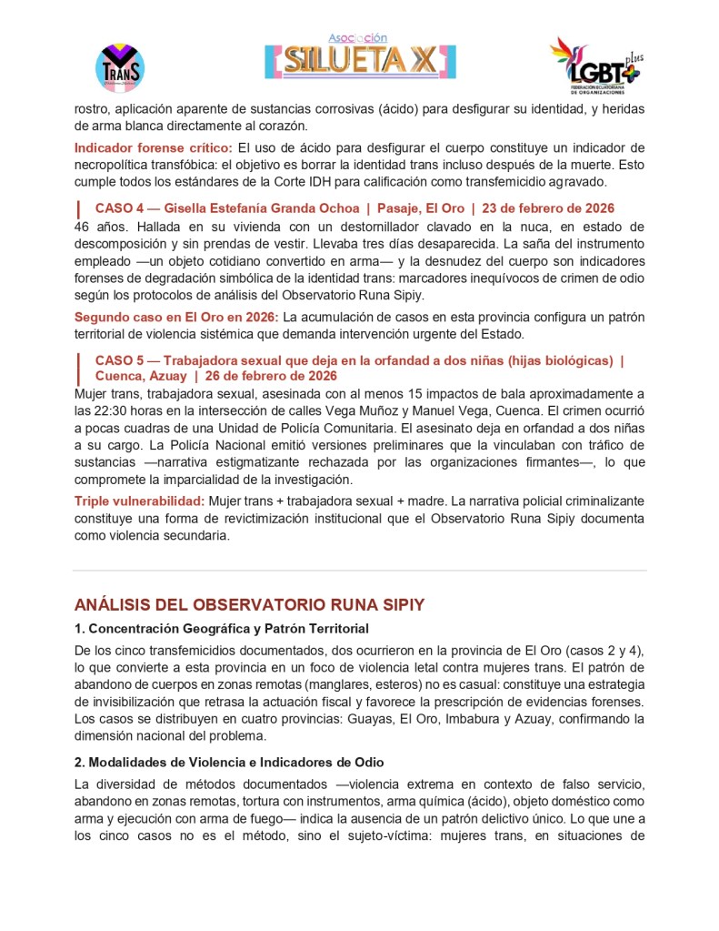 - A la Defensoría del Pueblo: Que se emita un pronunciamiento formal sobre la situación de los transfemicidios documentados en Ecuador en 2026 y se inicie una investigación defensorial de oficio.