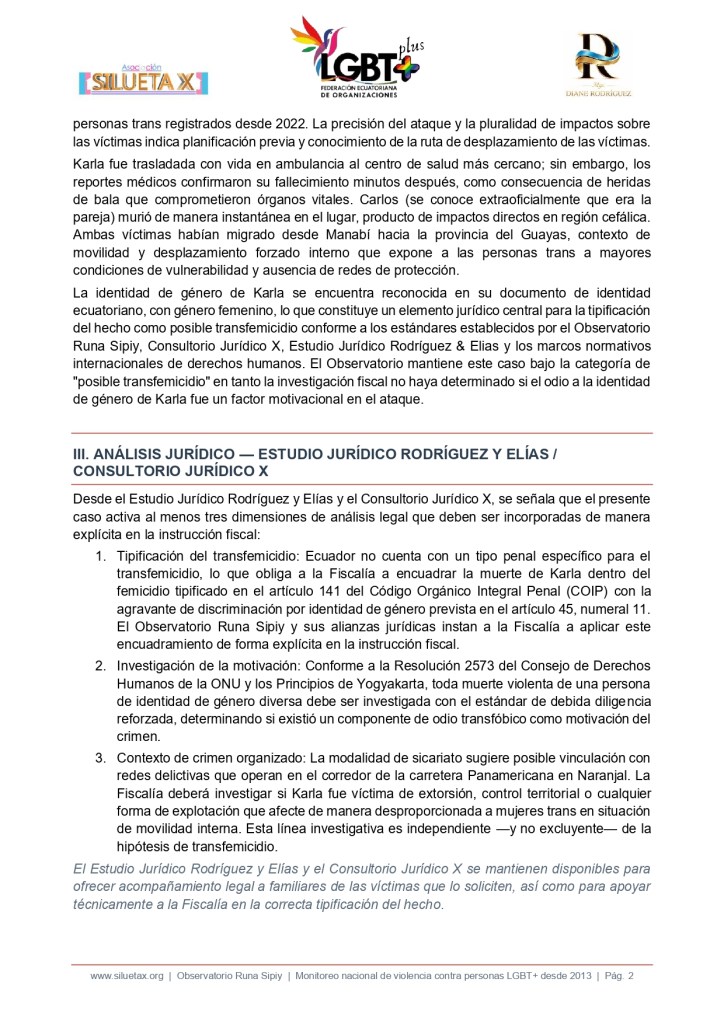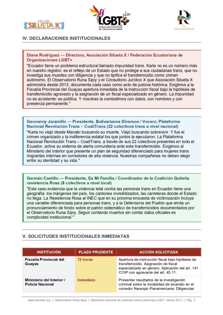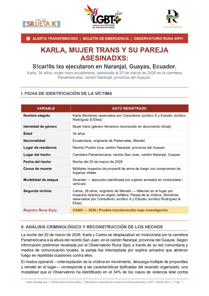 | Diane Rodríguez — Directora, Asociación Silueta X / Federación Ecuatoriana de Organizaciones LGBT+ «Ecuador tiene un problema estructural llamado impunidad trans. Karla no es un número más en nuestro registro: es el reflejo de un Estado que no protege a sus ciudadanas trans, que no investiga sus muertes con diligencia y que no tipifica el transfemicidio como crimen autónomo. El Observatorio Runa Sipiy y el Consultorio Jurídico X que Asociación Silueta X administra desde 2013, documenta cada caso como acto de justicia histórica. Exigimos a la Fiscalía Provincial del Guayas apertura inmediata de la instrucción fiscal bajo la hipótesis de transfemicidio agravado y la asignación de un fiscal especializado en género. La impunidad no es accidente: es política. Y nosotras la combatimos con datos, con nombres y con presencia permanente.» |