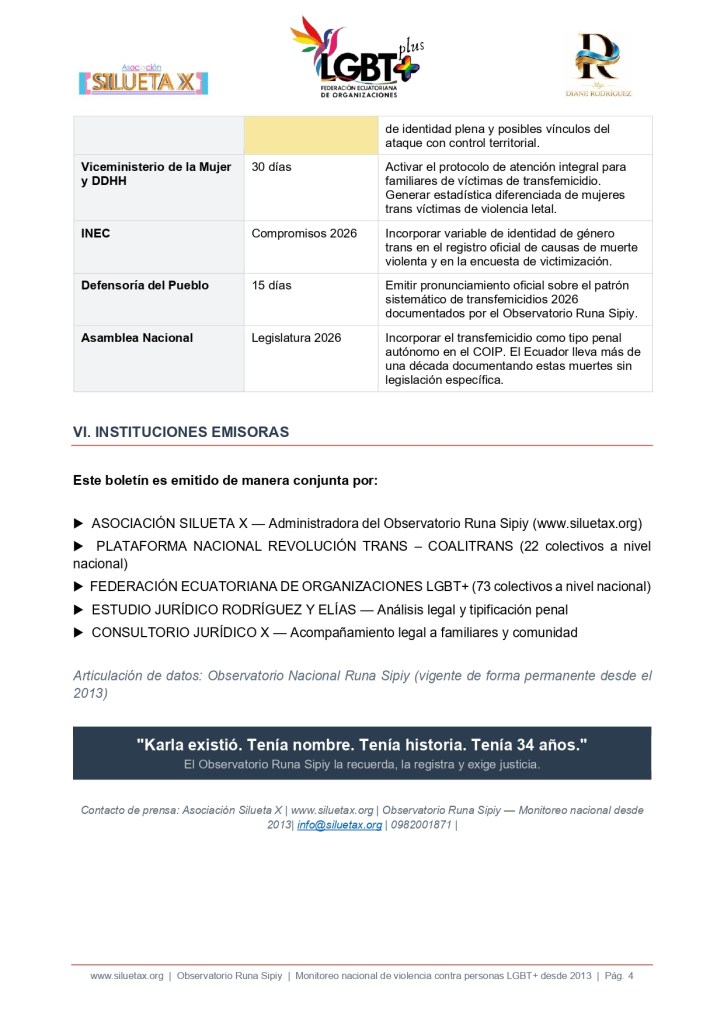 Contacto de prensa: Asociación Silueta X | http://www.siluetax.org | Observatorio Runa Sipiy — Monitoreo nacional desde 2013| info@siluetax.org | 0982001871 |